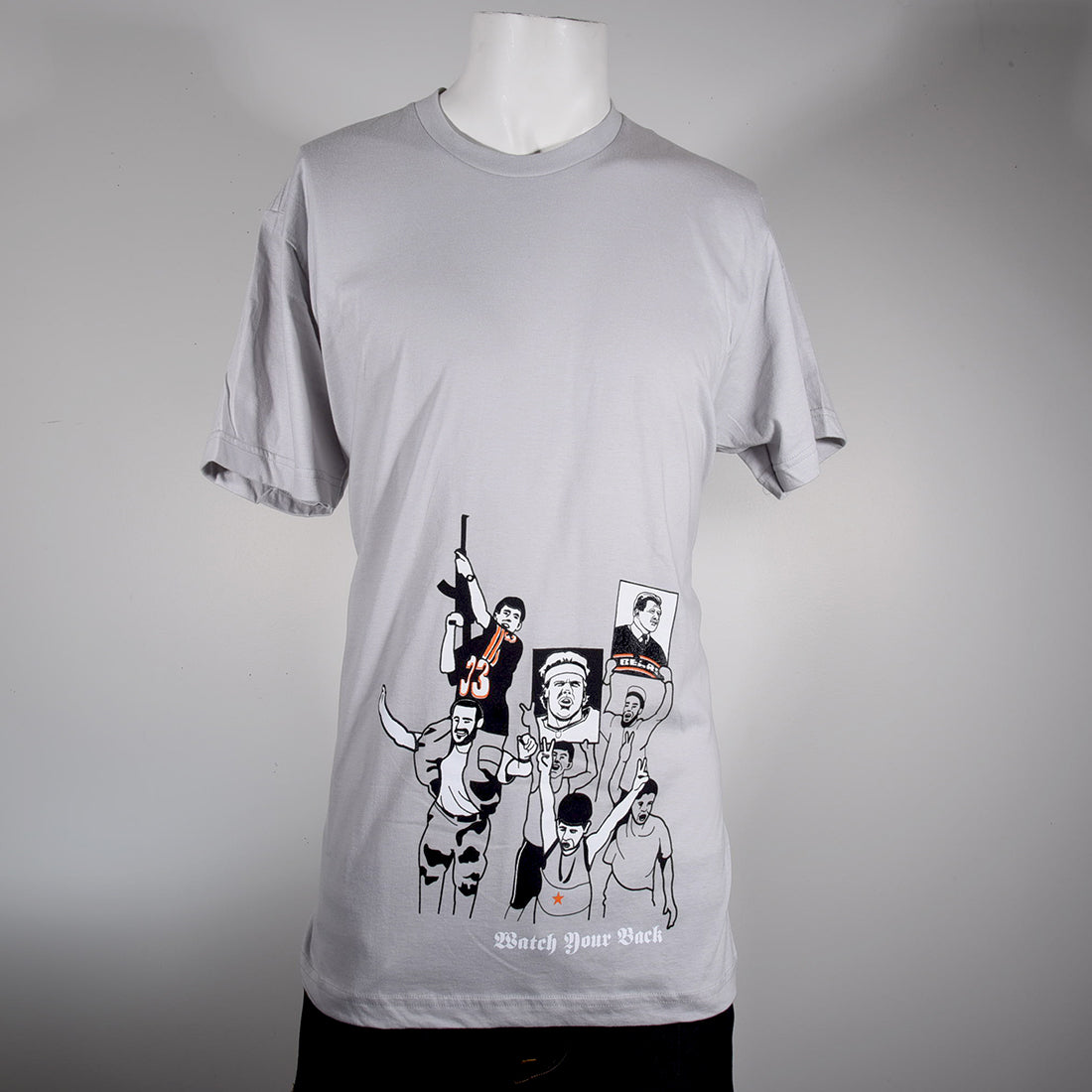 So full disclosure, the idea for this shirt came about completely at random. I had been doing research for a project about conspiracy theories and a website came up that was disputing if 9/11 was an inside job etc. The article had been peppered with photos, and in scrolling I came across the core image depicted: a spirited anti-American street celebration after the unfolding of the events on 9/11. So the kid with the AK-47 on the dude's shoulders literally was wearing a #33 Chicago Bears jersey in the photo. My first reaction was: THOSE BASTARDS!! (it wasn't). My second was: Who in the hell was #33 for the Bears back then?